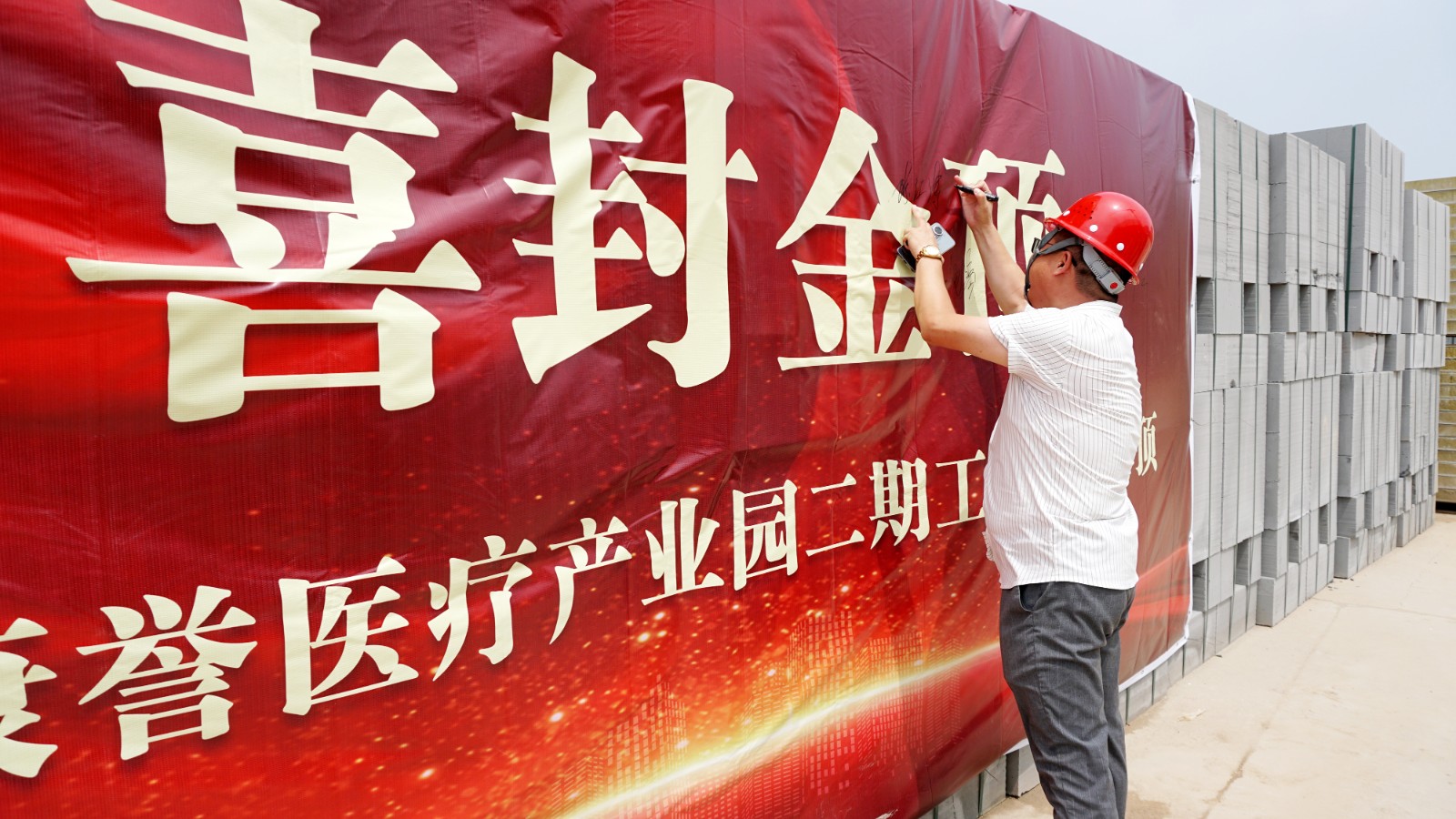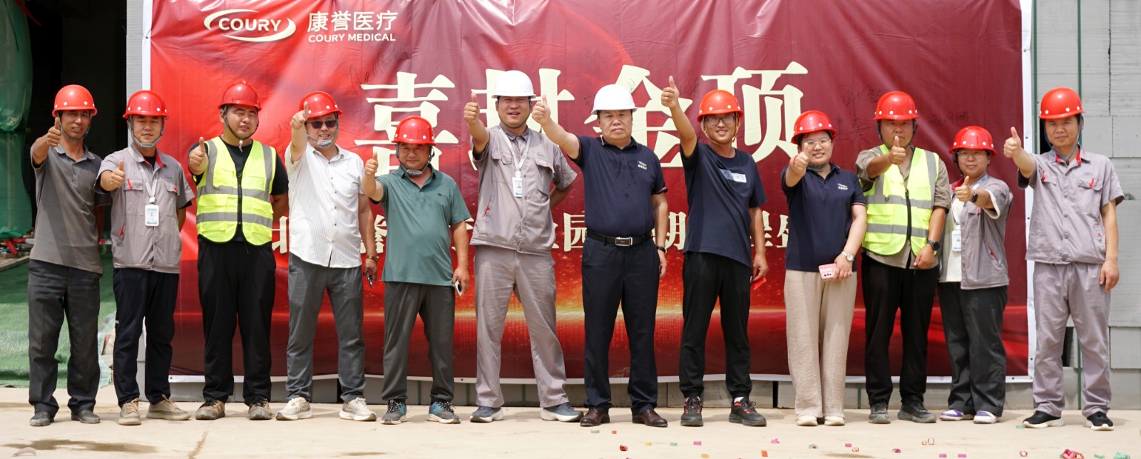 在倒班樓封頂這一重要時刻,集團副總經(jīng)理謝蘭廷、康譽醫(yī)療副總經(jīng)理張艷琴攜工程部及施工單位主要管理團隊來到現(xiàn)場,共同見證這一激動人心的建設成果。領導們紛紛在簽名墻上簽名留念,與建設者們一起合影,用鏡頭定格這一載入園區(qū)發(fā)展史冊的珍貴瞬間。